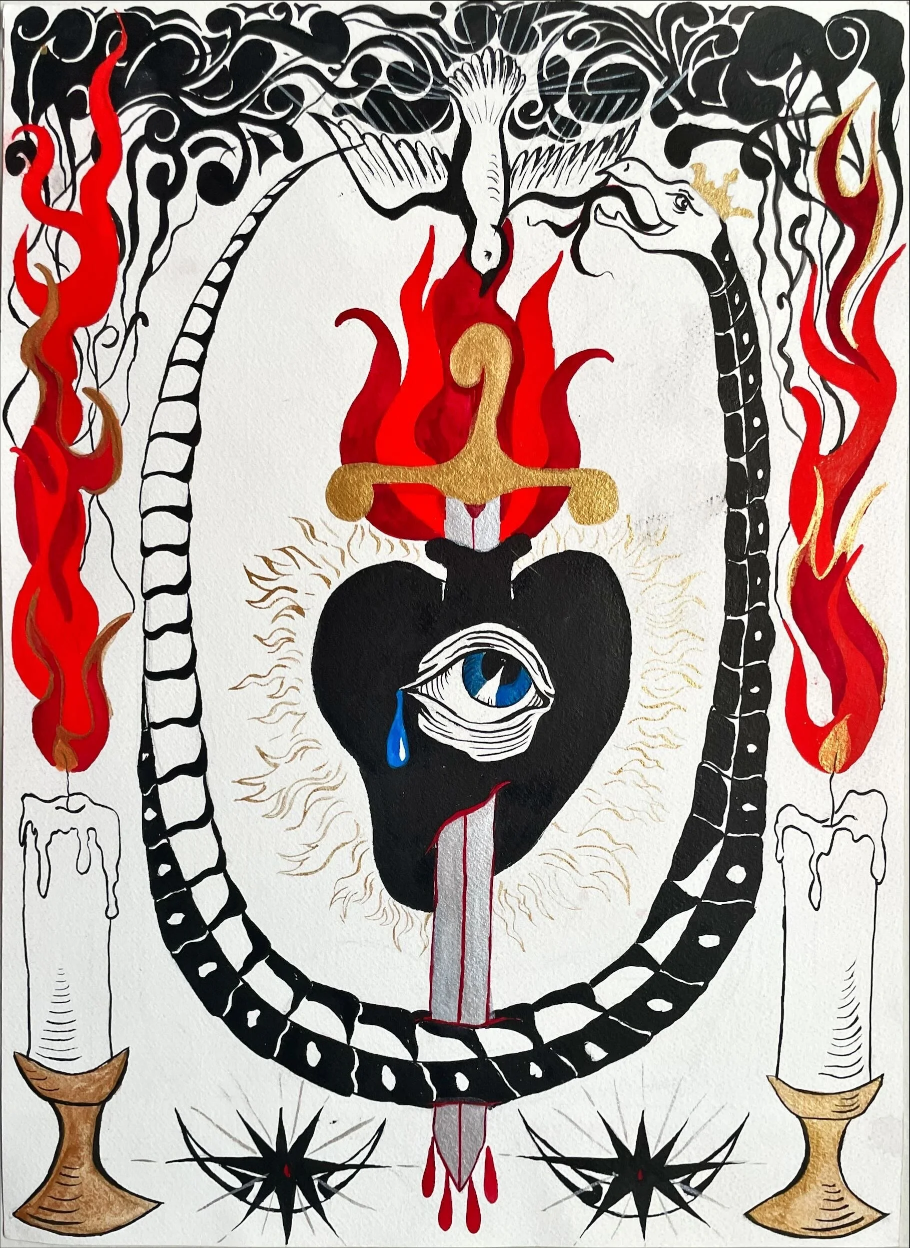 Through overlapping symbols including serpents, divine fire, blood, and the cosmos, the common narrative of spiritual development found in alchemy, tarot, and natural philosophies to find spiritual harmony and awareness, becomes parallel with Jesus Christ in Christianity. In this series, I use the principles of alchemy to separate and conjoin visual elements of these iconographies, a final narrative emerging which is half sinner, but all saint.