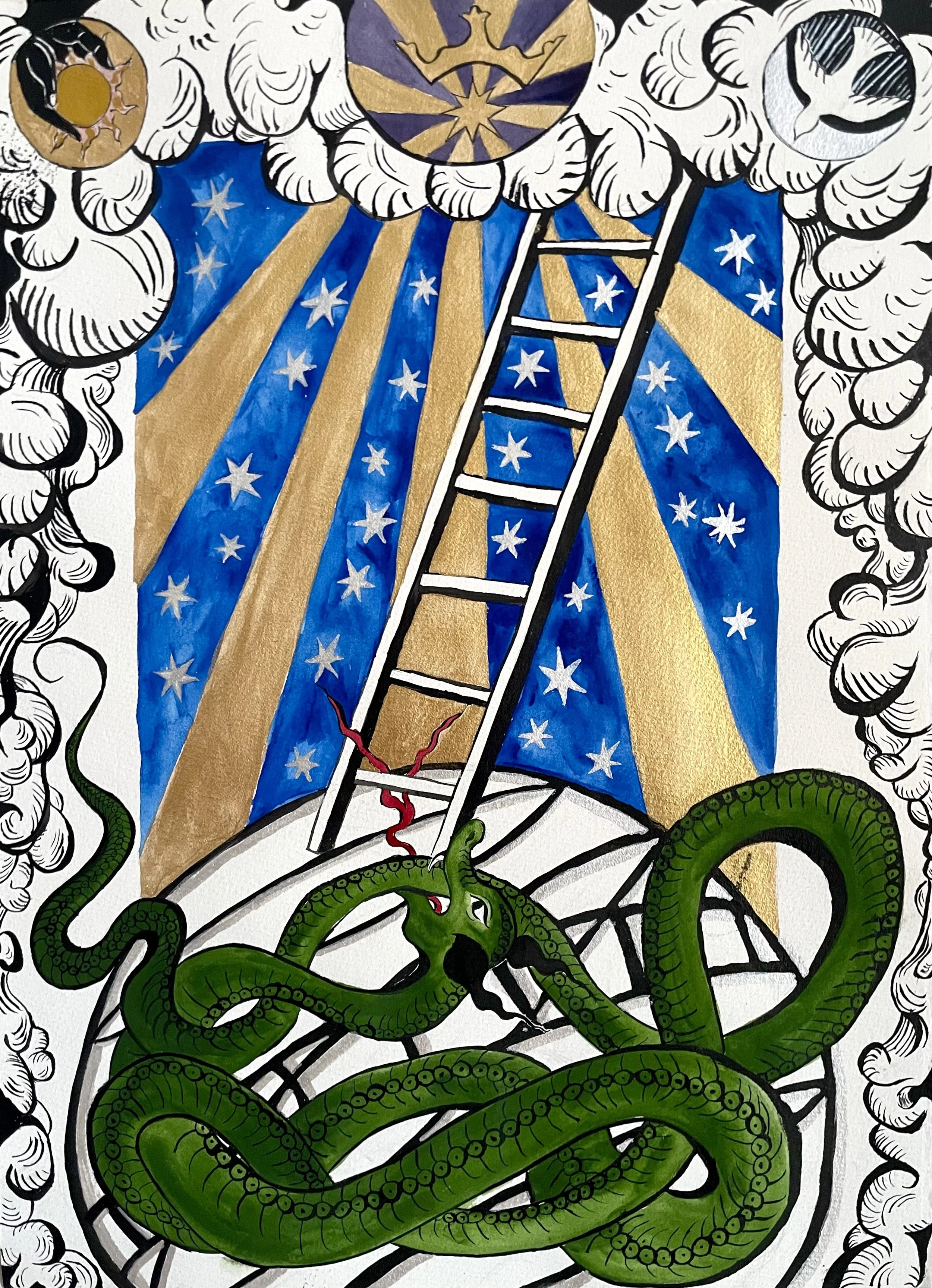 Similar to the story of Jacob’s Ladder where a dream reveals a ladder to heaven, a key aspect of alchemy is to climb the ladder of planets to reach a physical and spiritual perfection. The earth is punctuated by a serpent and the heavens with imagery of the Holy Trinity interacting with the sun, moon, and stars.