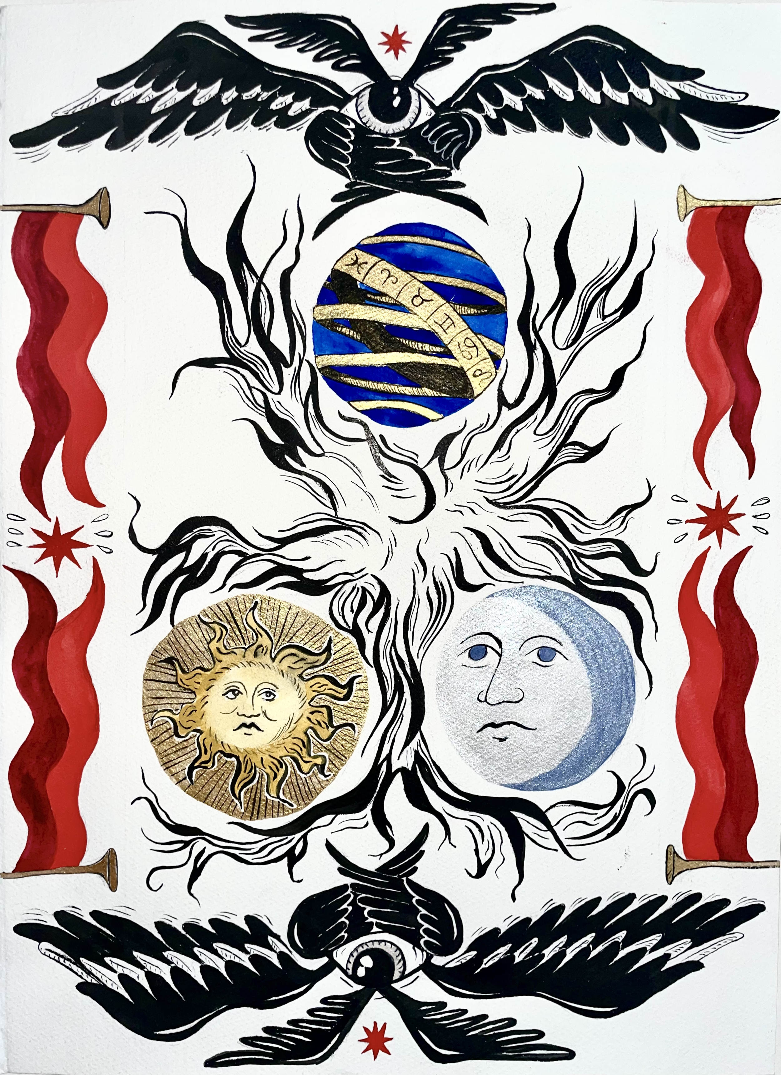 An alchemical marriage of the sun and moon, or divine feminine and masculine, sometimes likened to Jesus and the Virgin Mary, blooms from the roots of the Tree of Knowledge.