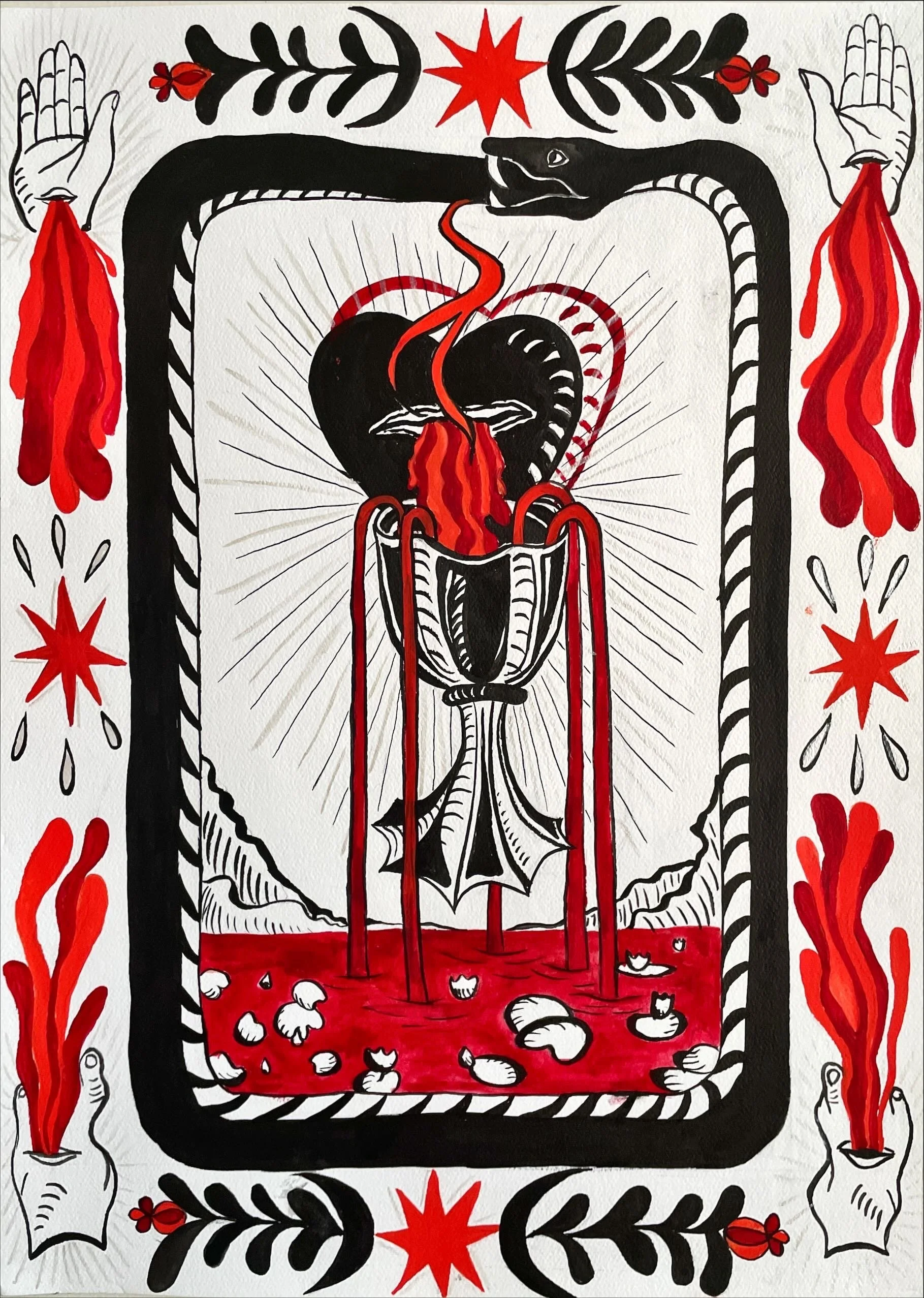 The Stigmata of Jesus Christ border an Ouroboros, a snake eating its own tail, a symbol of eternal death and rebirth. The central image mirrors the composition of the Ace of Cups in tarot to embody the blood of the covenant, similar to an alchemical fountain’s message of spiritual energy.