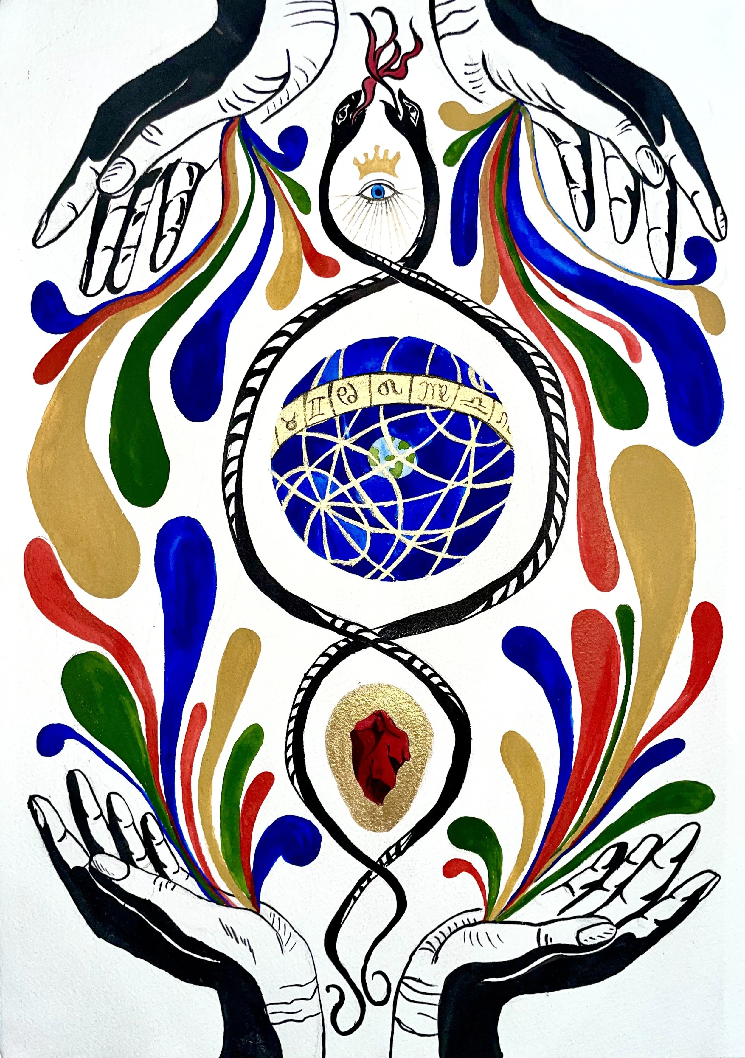 A compilation of all the colors in the limited palette of this series, Stage 7 marries the earthly and divine with the end goal of chemical alchemy, the philosopher’s stone. Encompassed within a vessel of two intertwined snakes along with a globe and all knowing eye, the stone is the result of divine wisdom meeting earthly creation in a balance of the above and below.