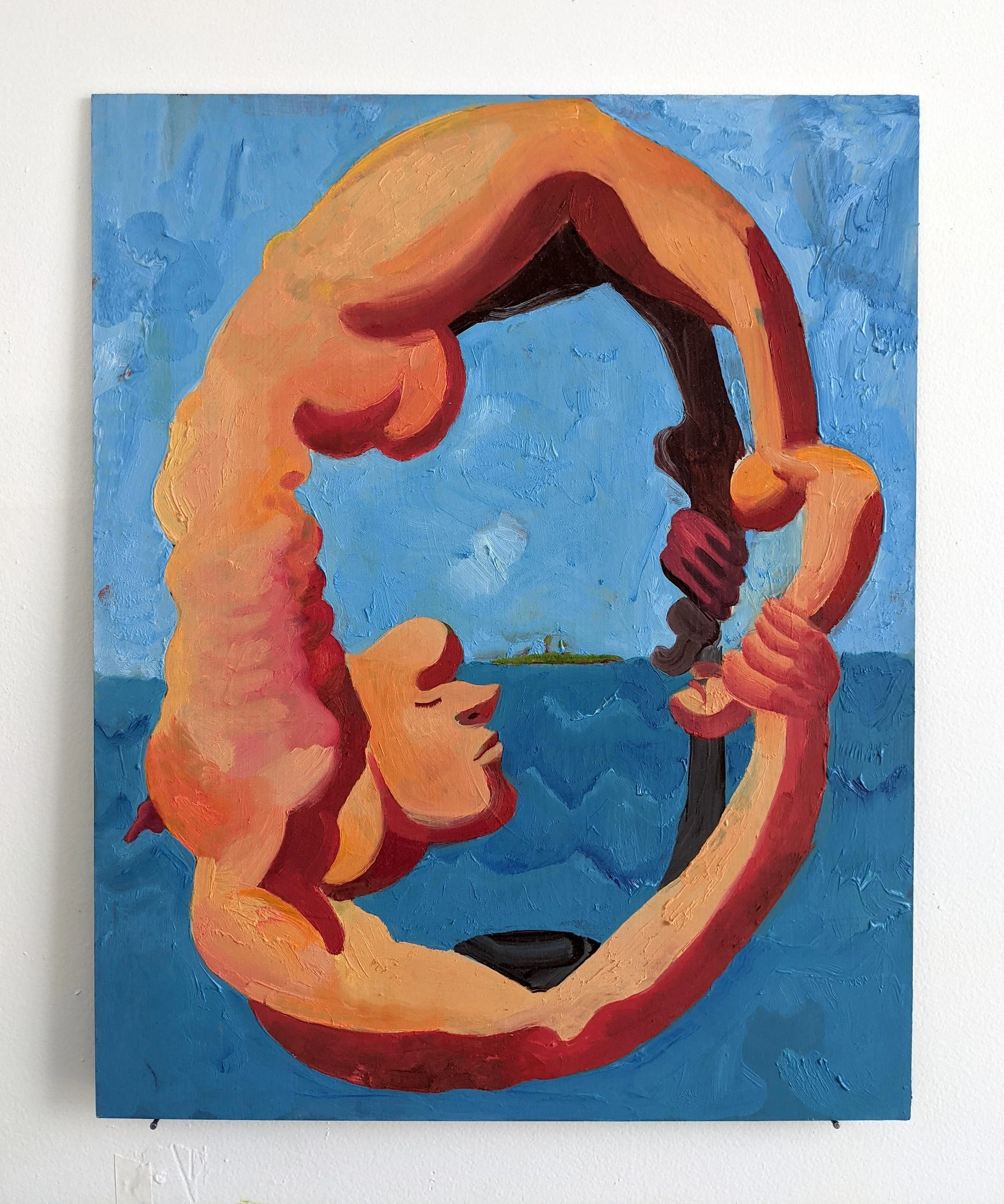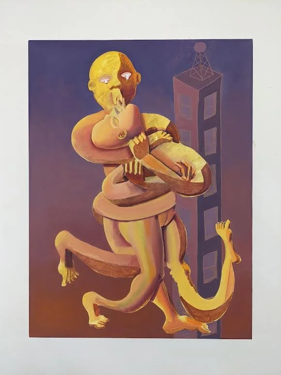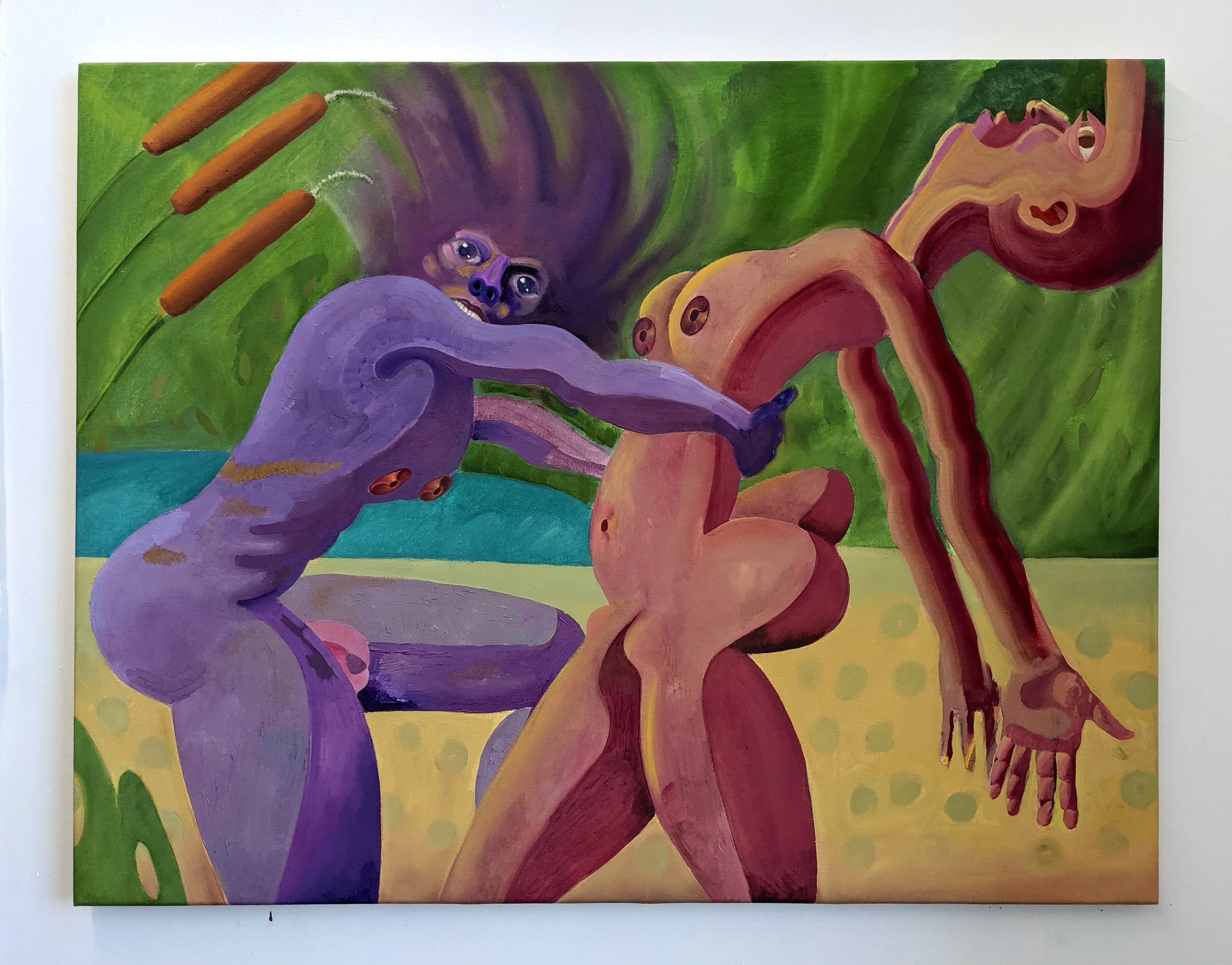This slippery instability is represented by figures that spill around the frame and bend awkwardly. Lips multiply, eyes bulge and legs twist and touch with a strange tenderness. My unnatural palette adds to the tension. Warm highlights next to cool shadows, periwinkle flesh and magenta limbs make a relatable world feel uncanny.