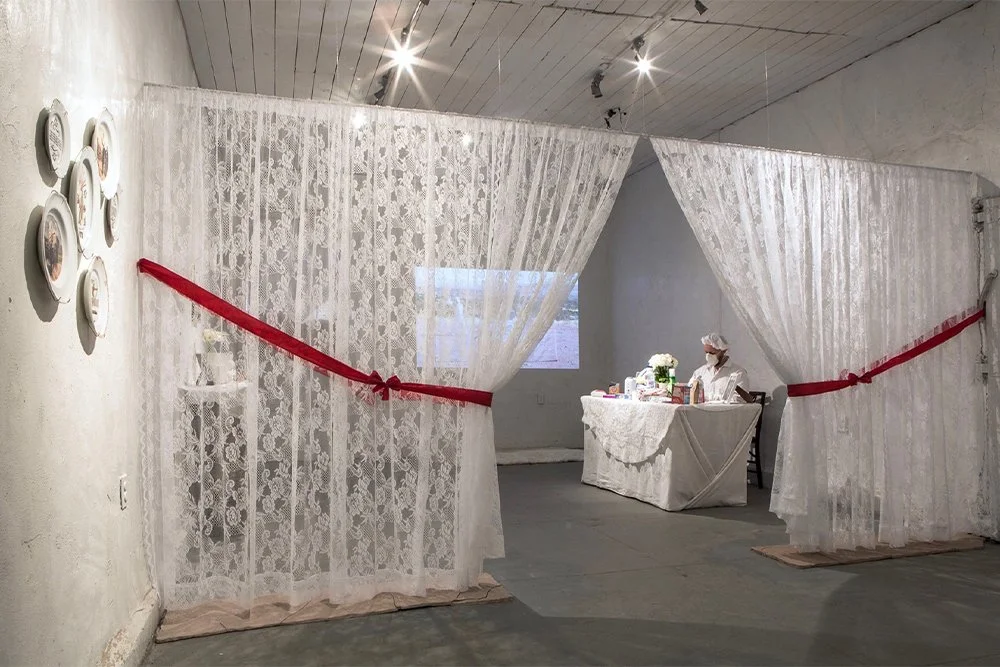 Detail of: I’ M P U R E (deeds) - performance. Table, white table cloth, white lace, doily, white coveralls, white shoes, white socks, white underwear, face mask, hairnet, pearl necklace, Mr. Clean Bliss gloves, Behr ultra pure white paint, Book of Mormon, mr. clean MagicEraser, Pure food grade gypsum, C&H pure cane sugar, Comet with bleach, Hanes 100% cotton panties, Wonder bread (classic white), Clorox Clean-Up, Nestle Pure Life purified water, ceramic mug, Great Value bleach, Clorox disinfecting wipes, Signature Care Xtreme whitening wraps, Tippy Toes baby powder (pure cornstarch), Shur Fine bleached flour, Arm & Hammer pure baking soda, table salt (100% natural), photo the LDS temple and site of the Mountain Meadows Massacre, frames. 2020. (image credit: Daniel Hojnacki)