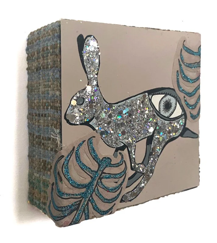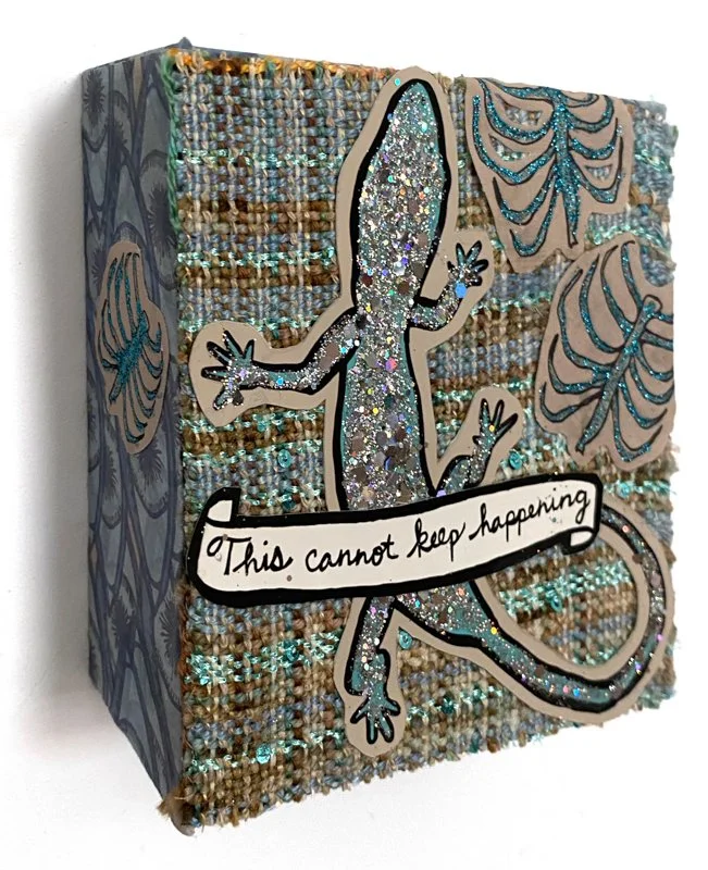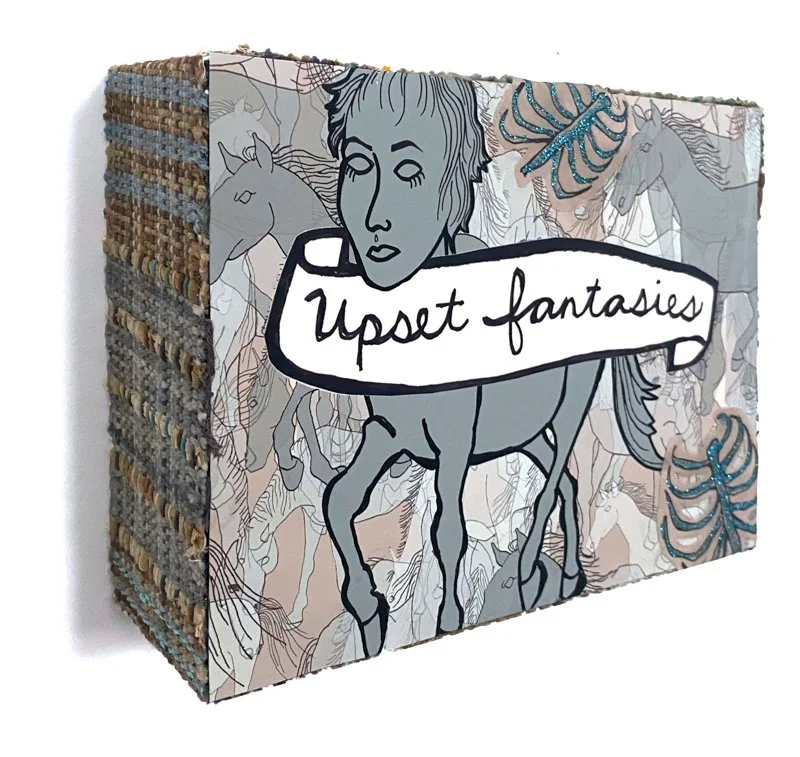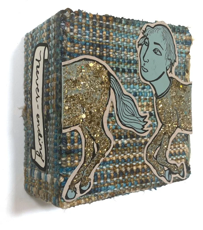 Spin, weave, draw, write. Woven and machine-made fabrics are attached to wooden blocks, wrapping a present. Sketches and textual ribbons are edited in Photoshop, personal emojis strung together to communicate my relationship with anxiety. Angels are guardians. Horses are strength. Ribs are protection. Insects are agitation. Each three-dimensional piece is further glitteringly dressed on its top and sides, creating sculptural wall hangings.
