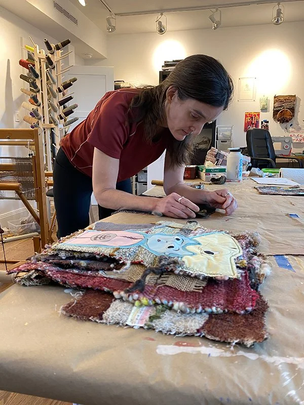 About 25 years ago, I worked as a digital artist and was very active in academia. Now I'm a fiber artist and I combine weaving, drawing, sewing, dyeing, spinning into fabric sculptures that I call fiber memoirs.