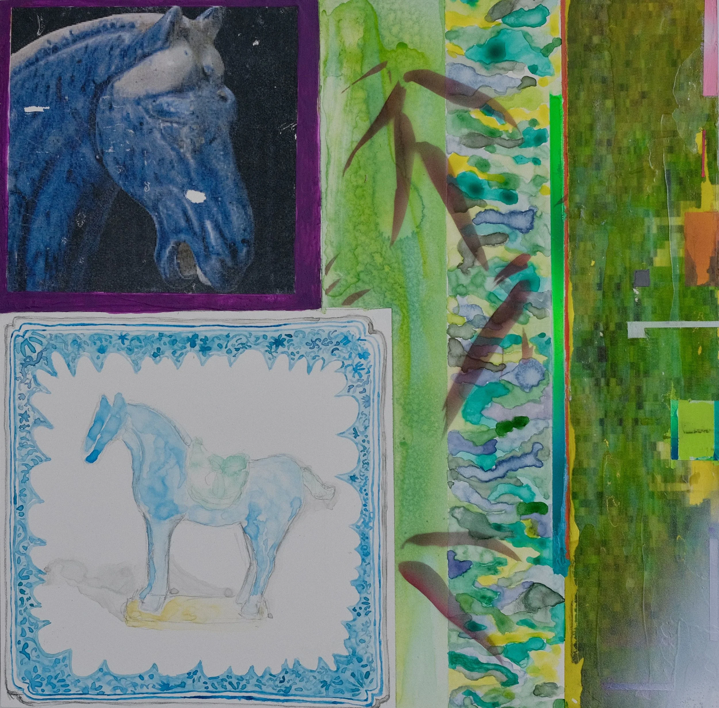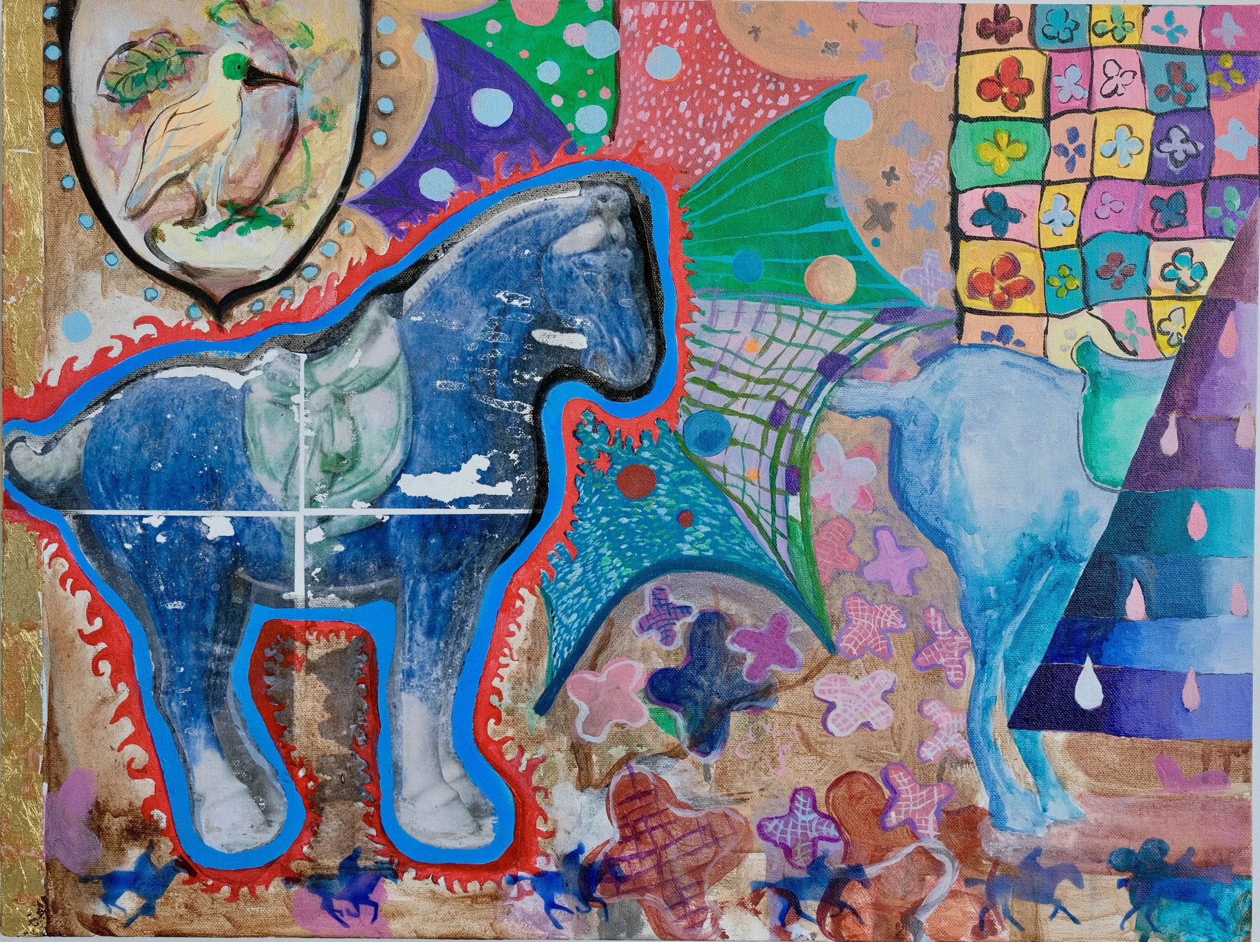 For example, in my painting “Untitled” I photo transferred an image of a blue horse from the Nelson Arkin Museum of Art’s Chinese collection. Then, at the bottom of the painting, I cut out a silhouette of a man riding a horse, running. The image is from the 1878 American photographer, Eadweard Muybridge, who made the first moving image. In a sense, it was also the first GIF.
