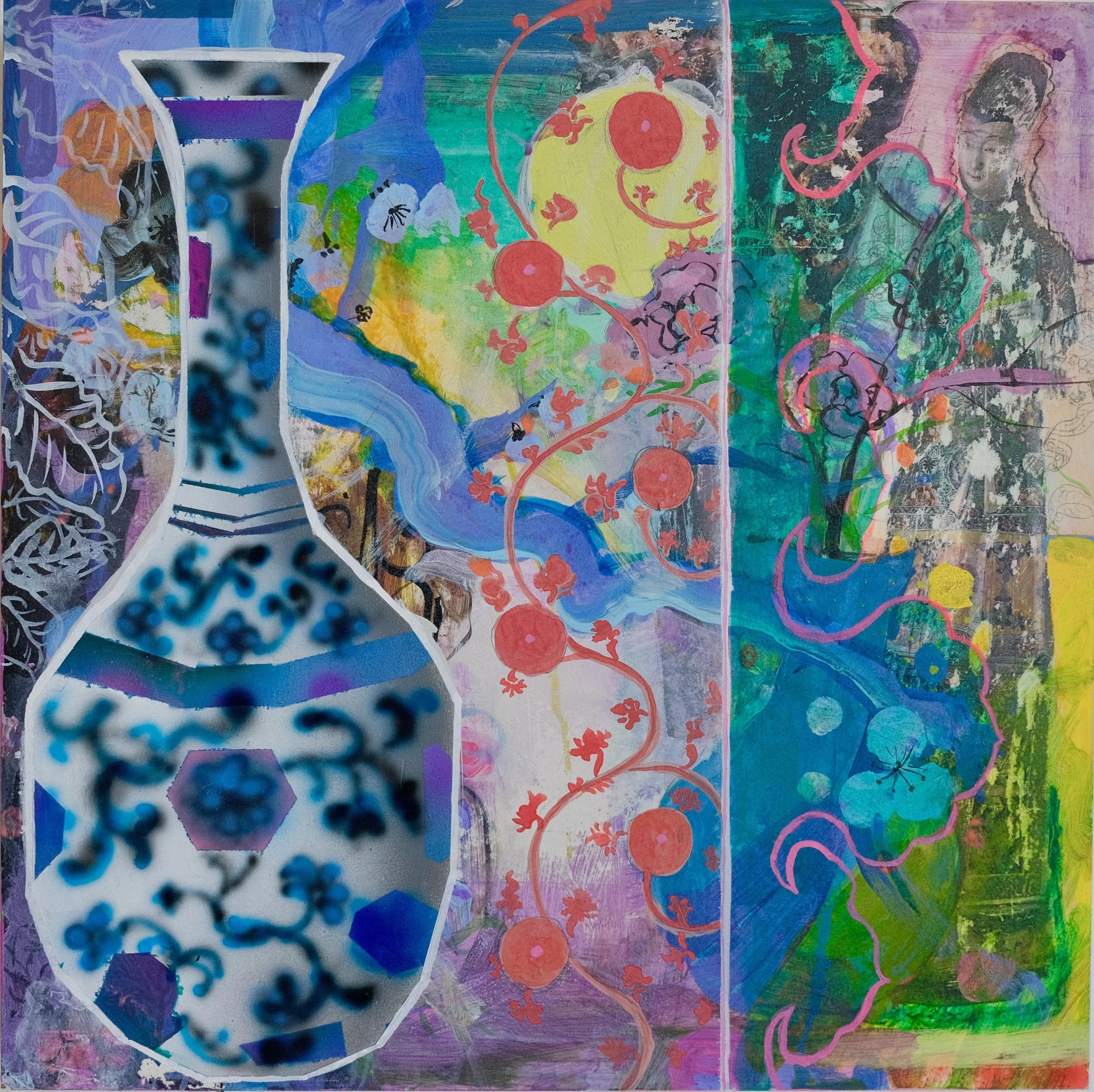 My artistic practice delves into the complex tapestry of intertwined themes and historical legacies, weaving a narrative that explores the intricate connection between Asian American personhood and the rich heritage of Asian art traditions. Drawing inspiration from diasporic objects that reside in Western museums, my paintings serve as a platform to recontextualize, interrogate, and unravel the layers of colonial legacy. Through the physical manipulation of paint, I take the imagery of traditional Asian tropes and question them on the canvas in a humorous or insouciant way.