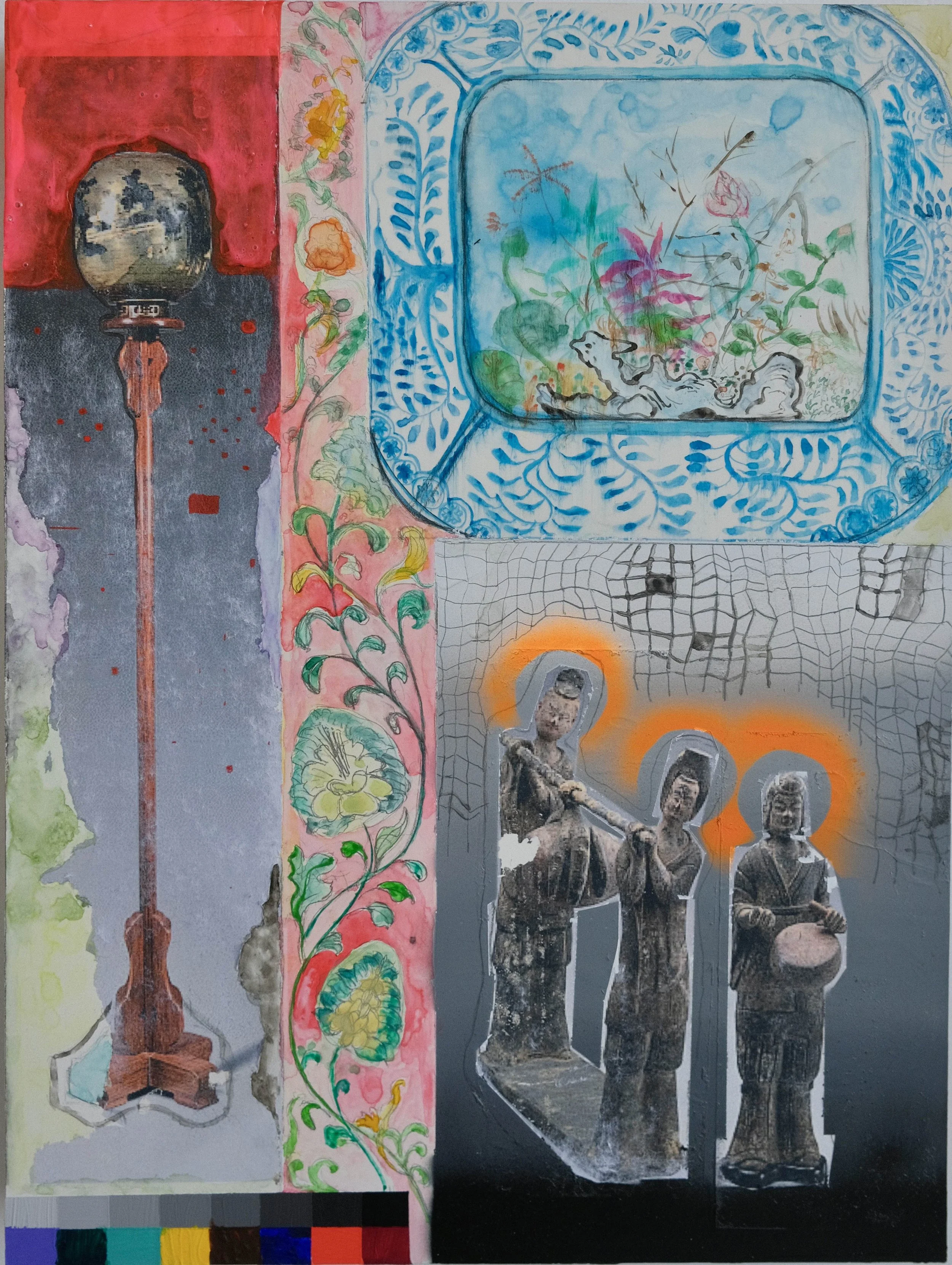 When I go to museum to visit an Asian art collection, I really enjoy the paintings and ceramics. Sometimes I try to look at stuff if there are interesting patterns and unique motifs that I can incorporate into my own work. I went to the Nelson Arkins Museum of Art a couple of months ago, and they have this wonderful life sized Guanyin sitting in front of a Buddhist themed mural. Having studied those objects with specialist, Lin Weichen at the University of Chicago, I finally understand the weight of those histories these objects hold. I was wondering, what it means to have a temple taken apart piece-by-piece, cut up block-by-block, and then transported to another side of the world to be installed for display.’ Sometime I wonder how the Guanyin feels, to be a God in a land where she supposes to be worshiped, now merely an object of beauty sitting very still in a museum space. Within the museum there’s a certain aura of time. What I want to do is bring an object out of the museum, already without context and reappropriate it into my paintings to address the object in a way that tries to give back more context.